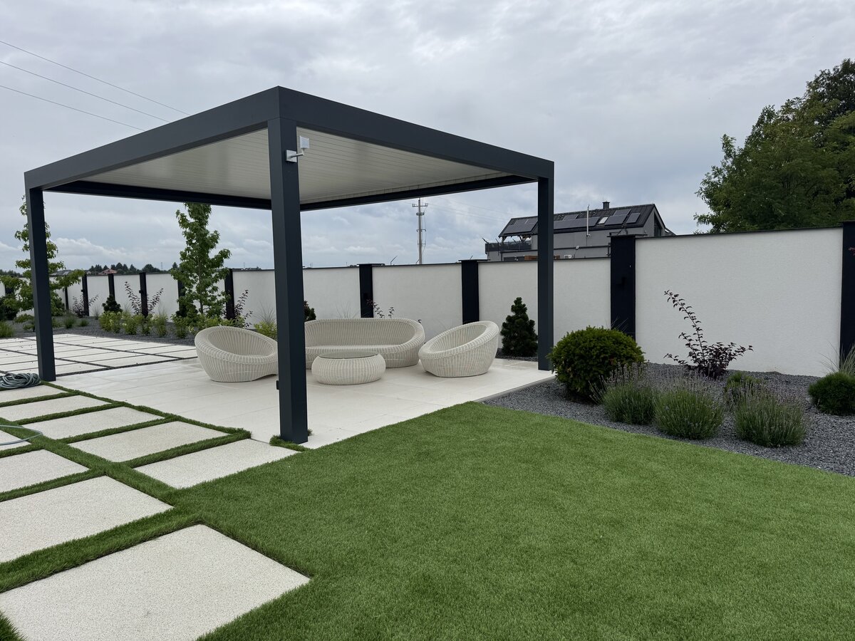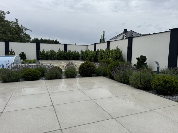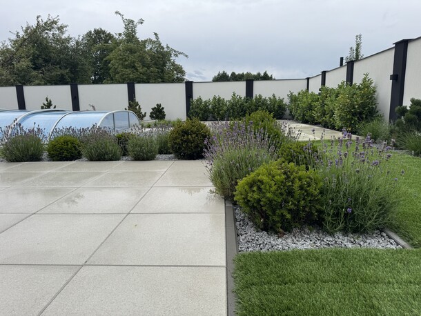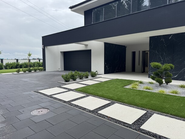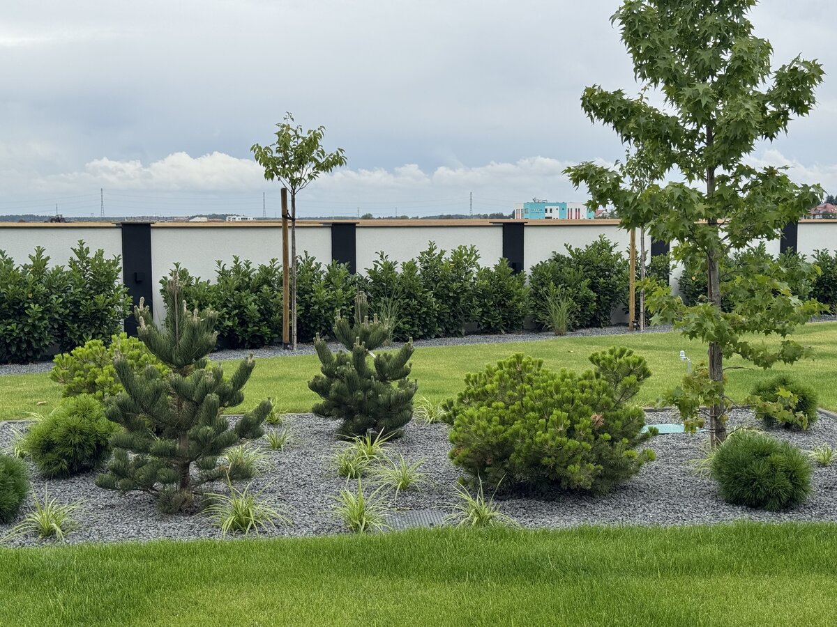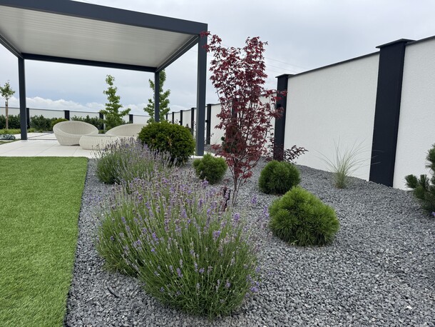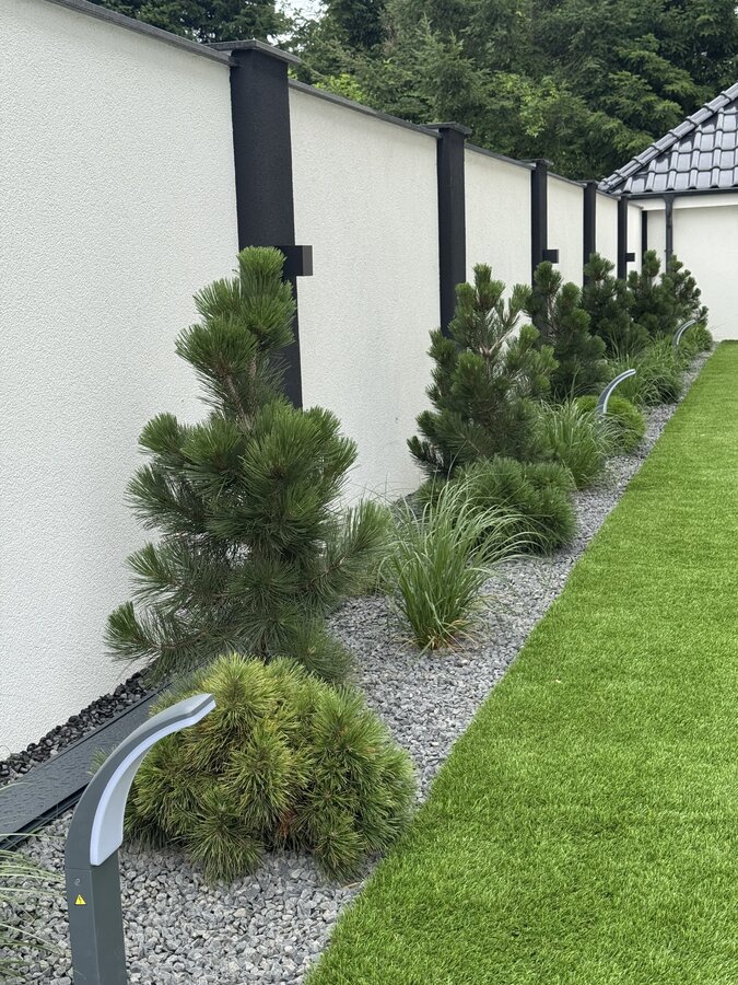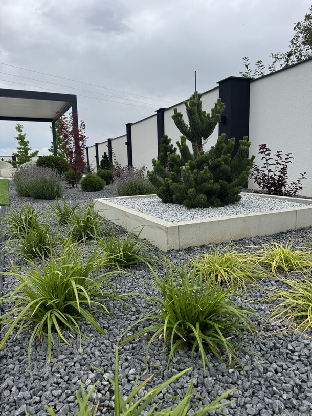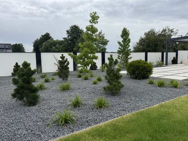 Zimozielony, nowoczesny ogród w stylu glamour, z przewagą ciekawych iglaków i z żywopłotem z laurowiśni. Rabaty zostały wysypane ciemnoszarym grysem bazaltowym, na ktorego tle zieleń wychodzi na pierwszy plan. Nowoczesna architektura o prostych liniach : bruki, tarasy stanowią świetne tło dla nasadzeń. Kwitnące drzewa i krzewy : wiśnie ozdobne, ambrowce, klon japoński oraz trawy ozdobne, lawendy urozmaicają i ożywiają ogród. Od wiosny do jesieni pojawiają się kolory, a zimą mamy ciekawy widok z domu, czyli reprezentacyjny ogrod przez cay rok.